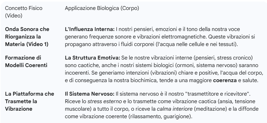 Il corpo umano è composto per circa il 60-70% di acqua. L'acqua non è solo un fluido passivo; è una struttura complessa che può essere influenzata dalle vibrazioni.
